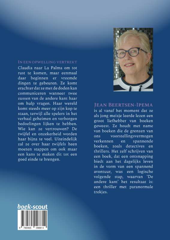 Over de auteur Jean Beertsen- Samenvatting In een opwelling vertrekt Claudia naar La Palma om tot rust te komen, maar eenmaal daar beginnen er vreemde dingen te gebeuren. Ze komt erachter dat ze met de doden kan communiceren wanneer twee zussen van de andere kant haar om hulp vragen. Haar wereld komt steeds meer op zijn kop te staan, terwijl alle spelers in het verhaal geheimen en verborgen bedoelingen lijken te hebben. Wie kan ze vertrouwen? De twijfel en onzekerheid worden haar bijna te veel. Uiteindelijk zal ze over haar twijfels heen moeten stappen om ook maar een kans te maken dit tot een goed einde te brengen. Productinformatie | |||||